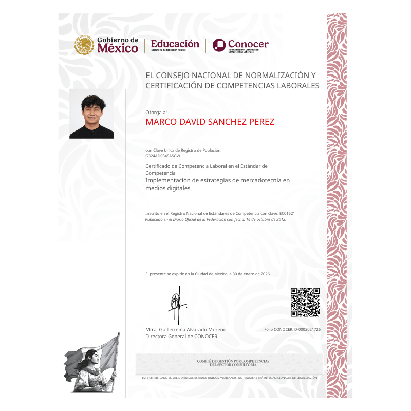 Al finalizar el programa, podrás optar por un proceso de evaluación para obtener un Certificado de Competencia Laboral con validez oficial, emitido a través del sistema CONOCER de la Secretaría de Educación Pública.